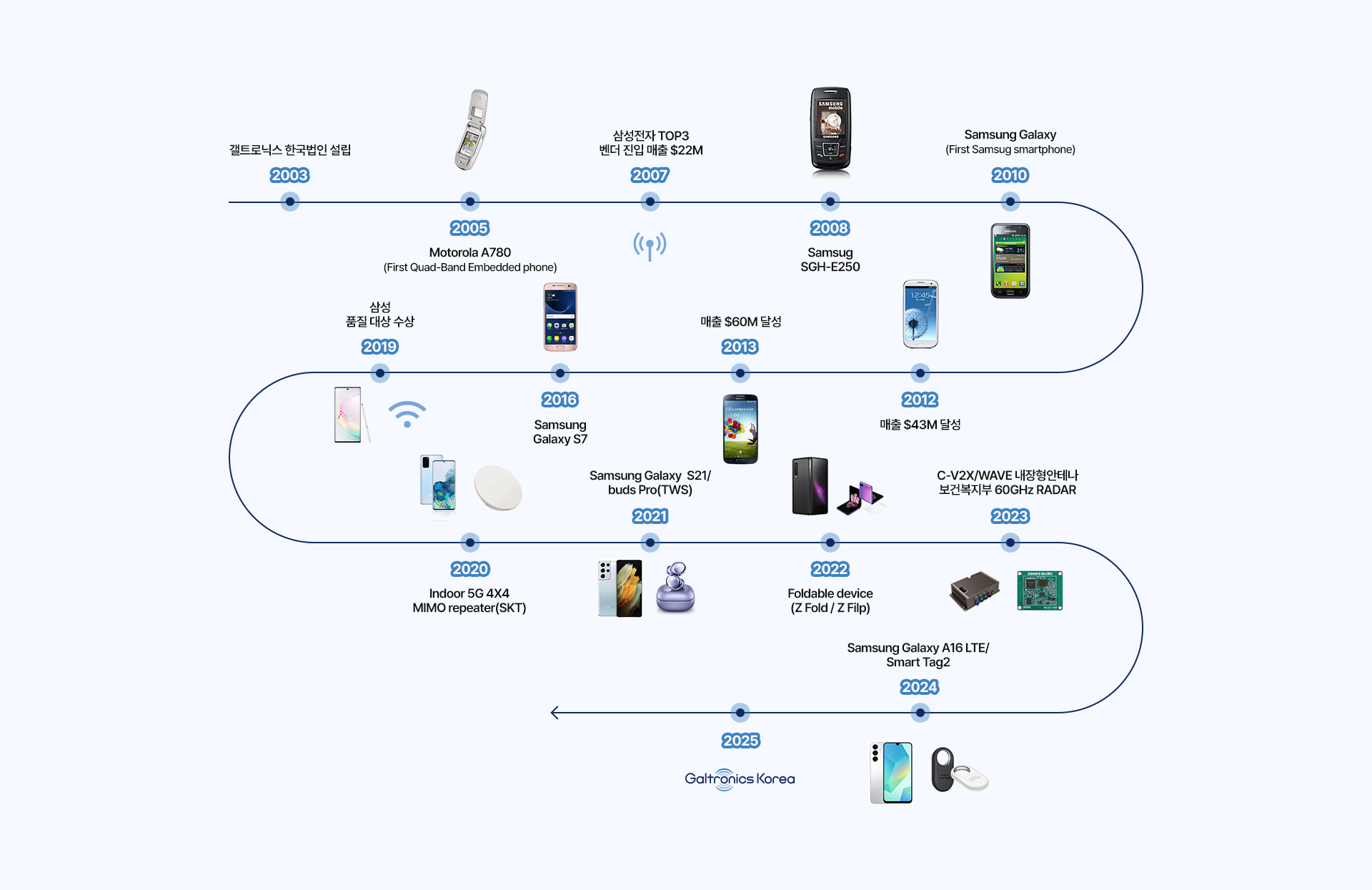 갤트로닉스코리아는 삼성전자와 국내/외 글로벌 통신, 모바일, 자동차, IoT, 그리고 가전 브랜드에 안테나 및 관련 제품을 공급하는 신뢰받는 제조업체로서,